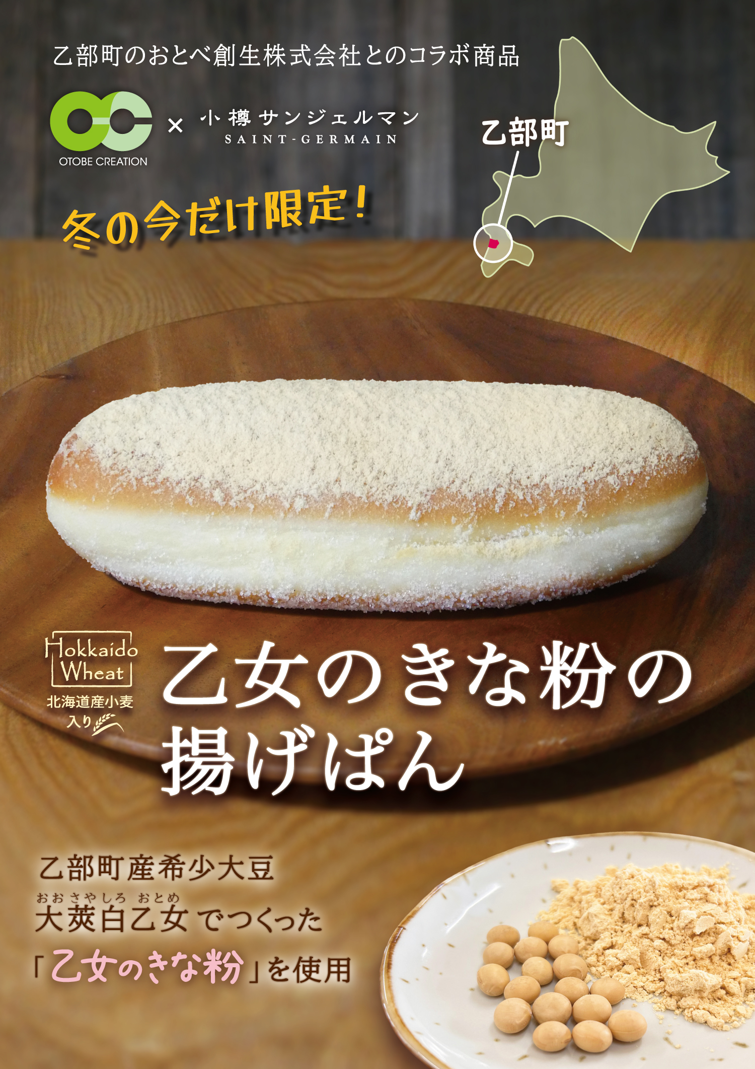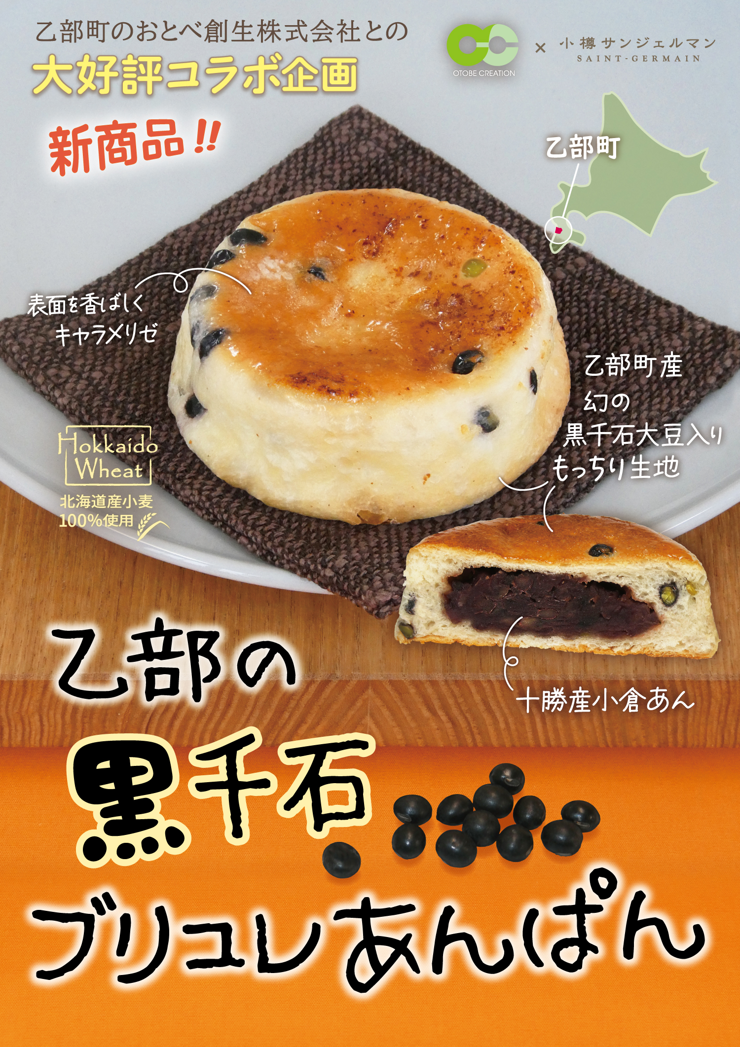 株式会社レフボンが運営する、小樽サンジェルマンでは、おとべ創生株式会社とのコラボレーションにより、乙部町産”黒千石大豆”を使用した「乙部の黒千石ブリュレあんぱん」と、乙部町産大豆”大莢白乙女のきな粉”(乙女のきな粉)を使用した「乙女のきな粉の揚げぱん」を発売します。